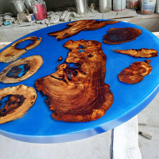Кръгла маса от синя епоксидна смола и парчета корен от японска акация - PMD 091