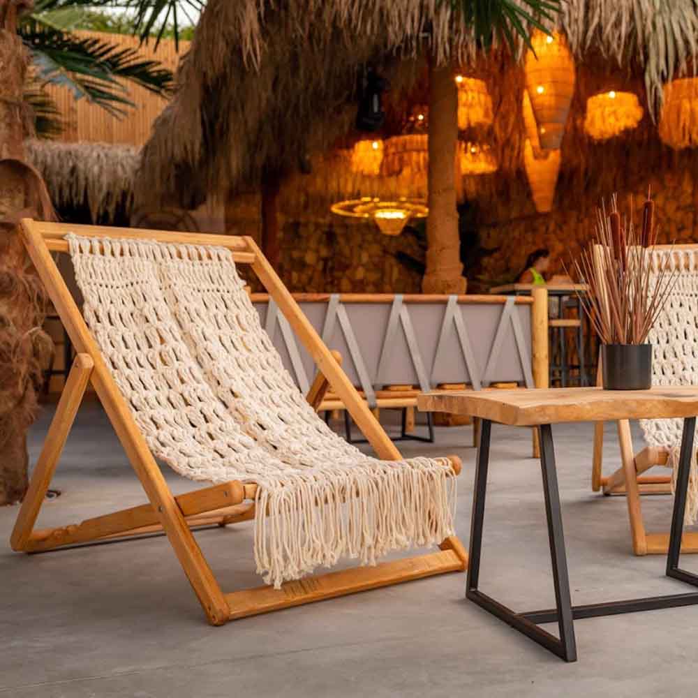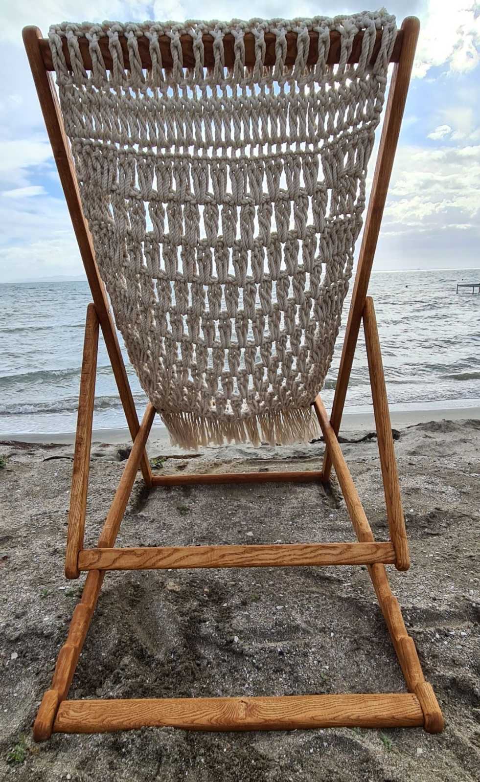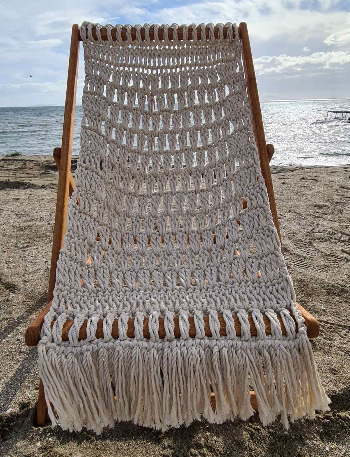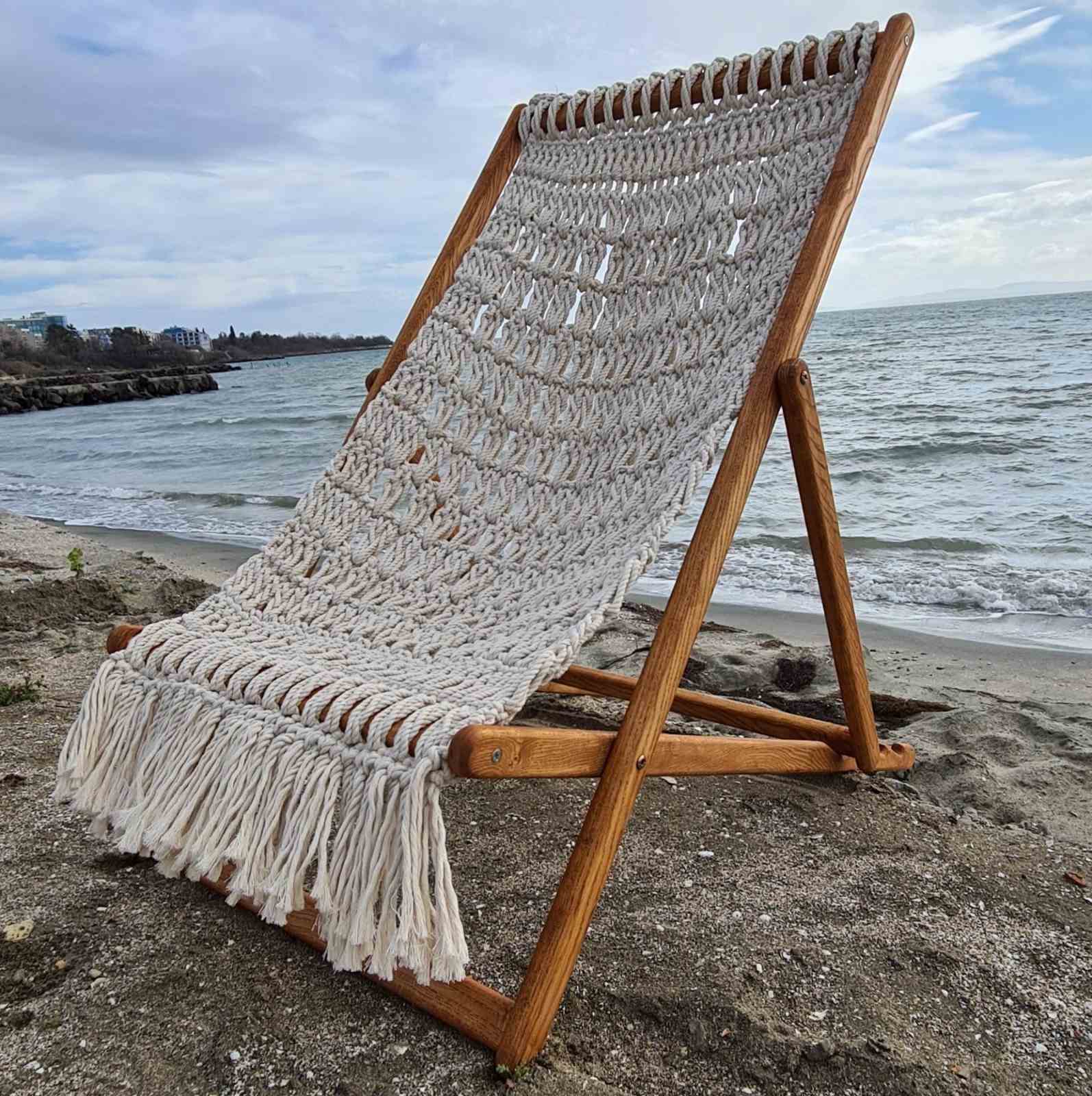 Екзотичен бохо шезлонг, изработен от масивно дърво и декориран с изящна плетка от памучно въже Макраме. Достъпен в четири цветови варианта – бял, екрю, капучино или черен – този шезлонг е идеалното допълнение към всеки дом, ресторант или бийч бар, търсещ екзотична нотка. Изработен с внимание към всеки детайл, този шезлонг ще ви пренесе на тропически плаж или в уютна бохемска градина.