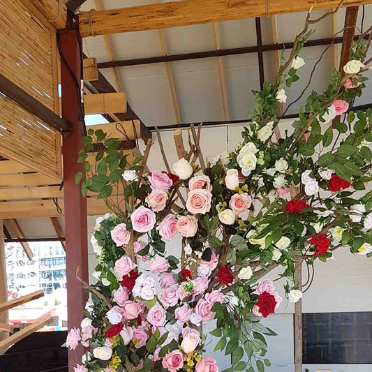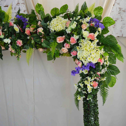 Сватбена арка от изкуствено озеленяване и разноцветни цветя 04