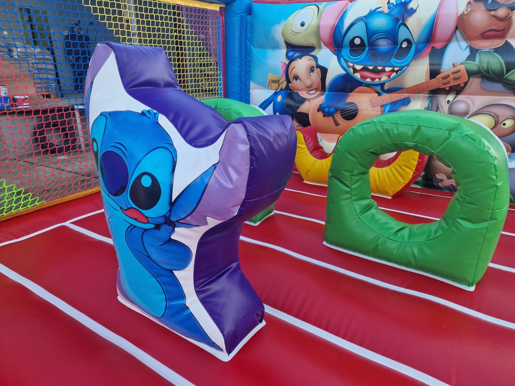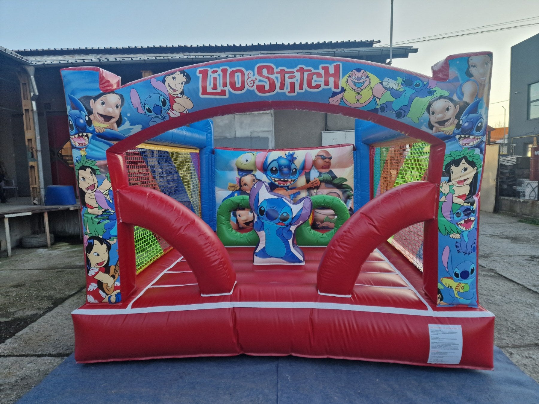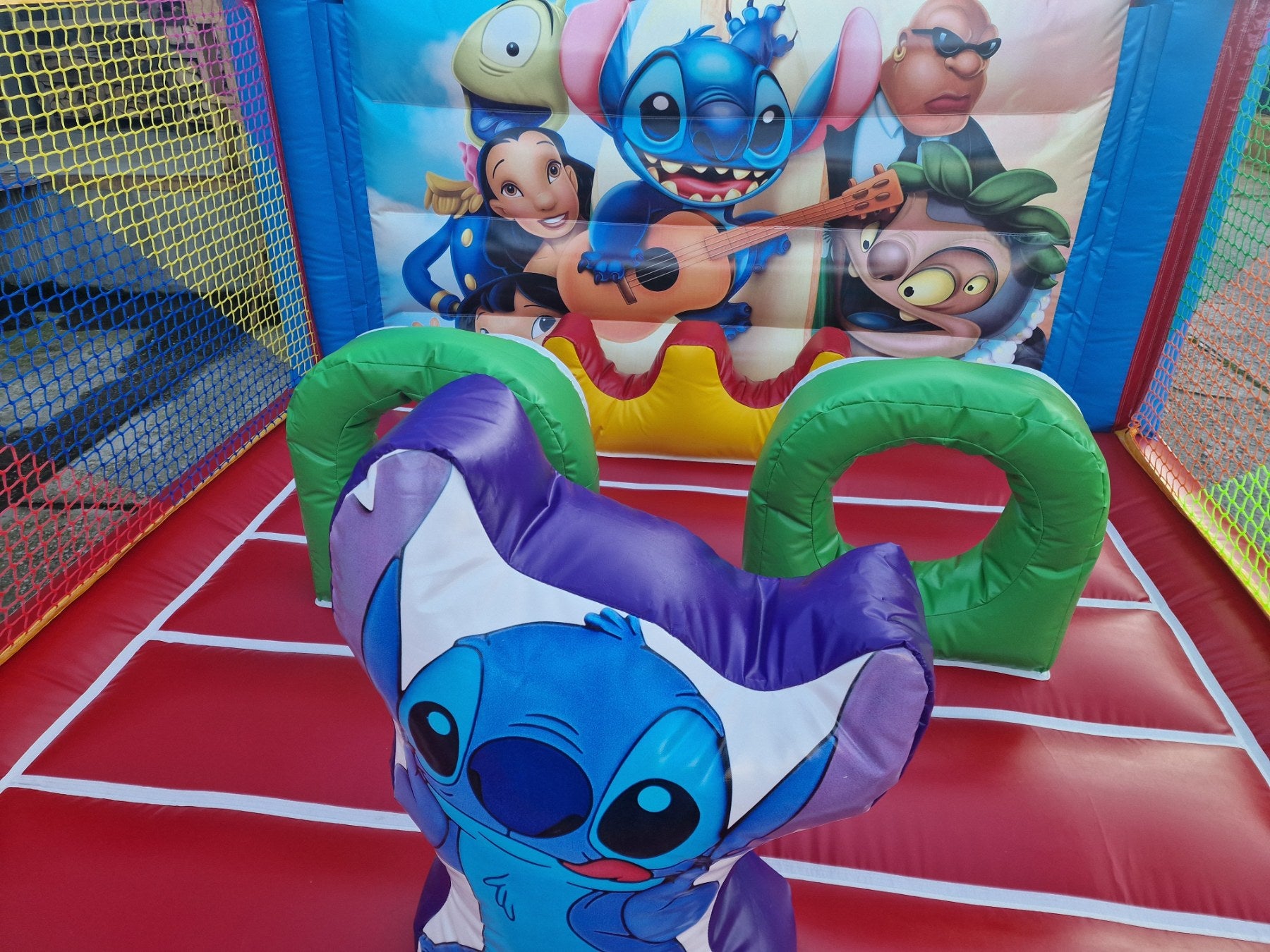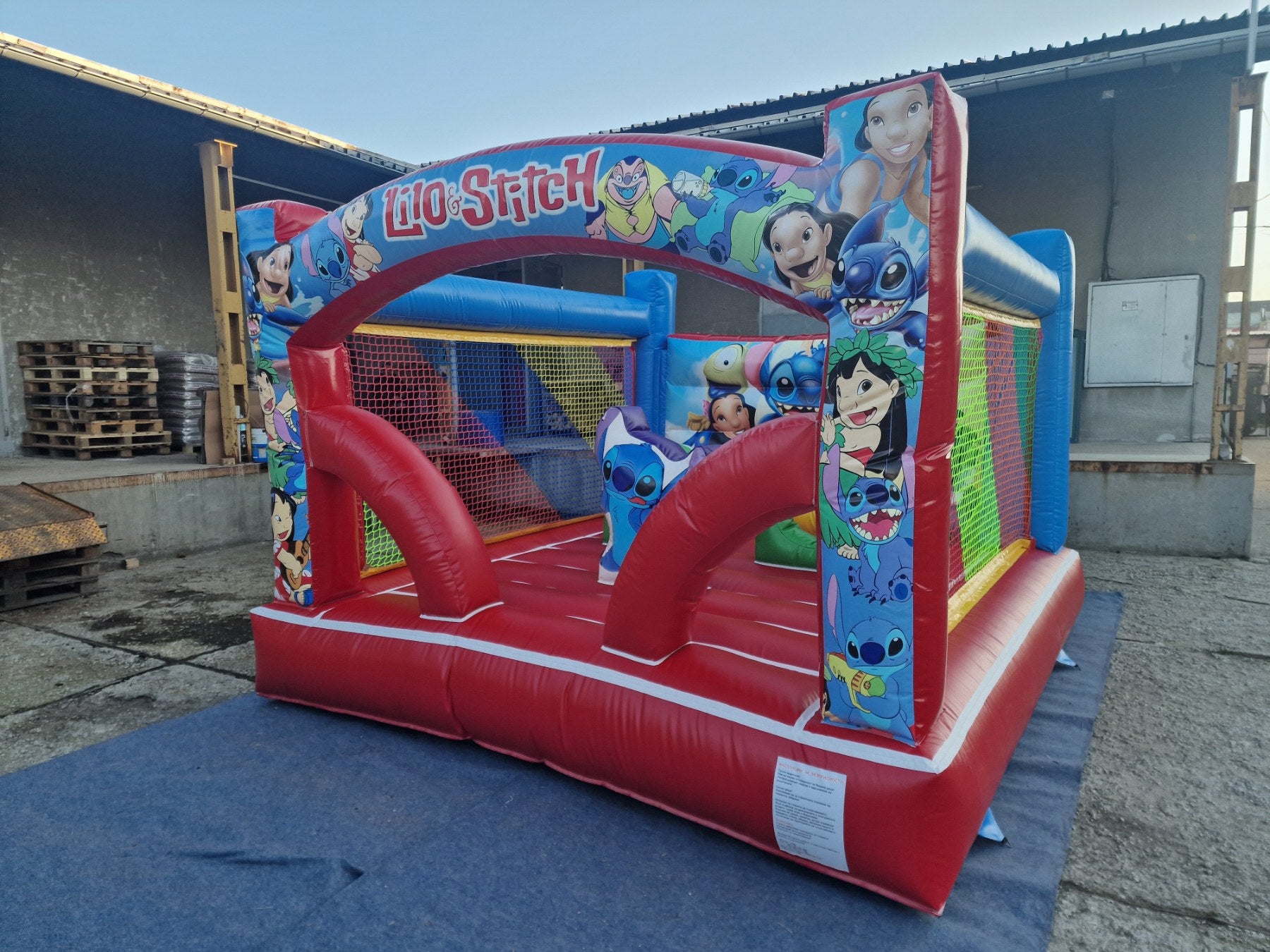 Надуваемият батут с тематика „Лило и Стич“ носи истинско настроение за игра и приключения с веселите си цветове и усмихнати анимационни герои. Той разполага с удобна зона за скачане, забавни надуваеми фигури с героите от филма и защитни мрежи, които правят играта още по-вълнуваща и спокойна за родителите. Изработен е от здрав и качествен PVC материал с принт илюстрации, който е приятен на допир и издържа на активно детско забавление. Стабилната конструкция и добре подсилените шевове осигуряват сигурност и дълготрайна употреба по време на безкрайните детски игри.