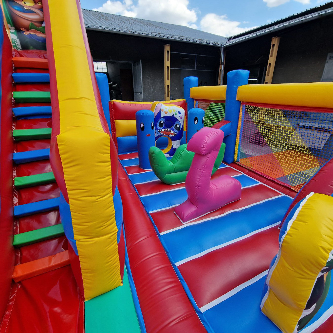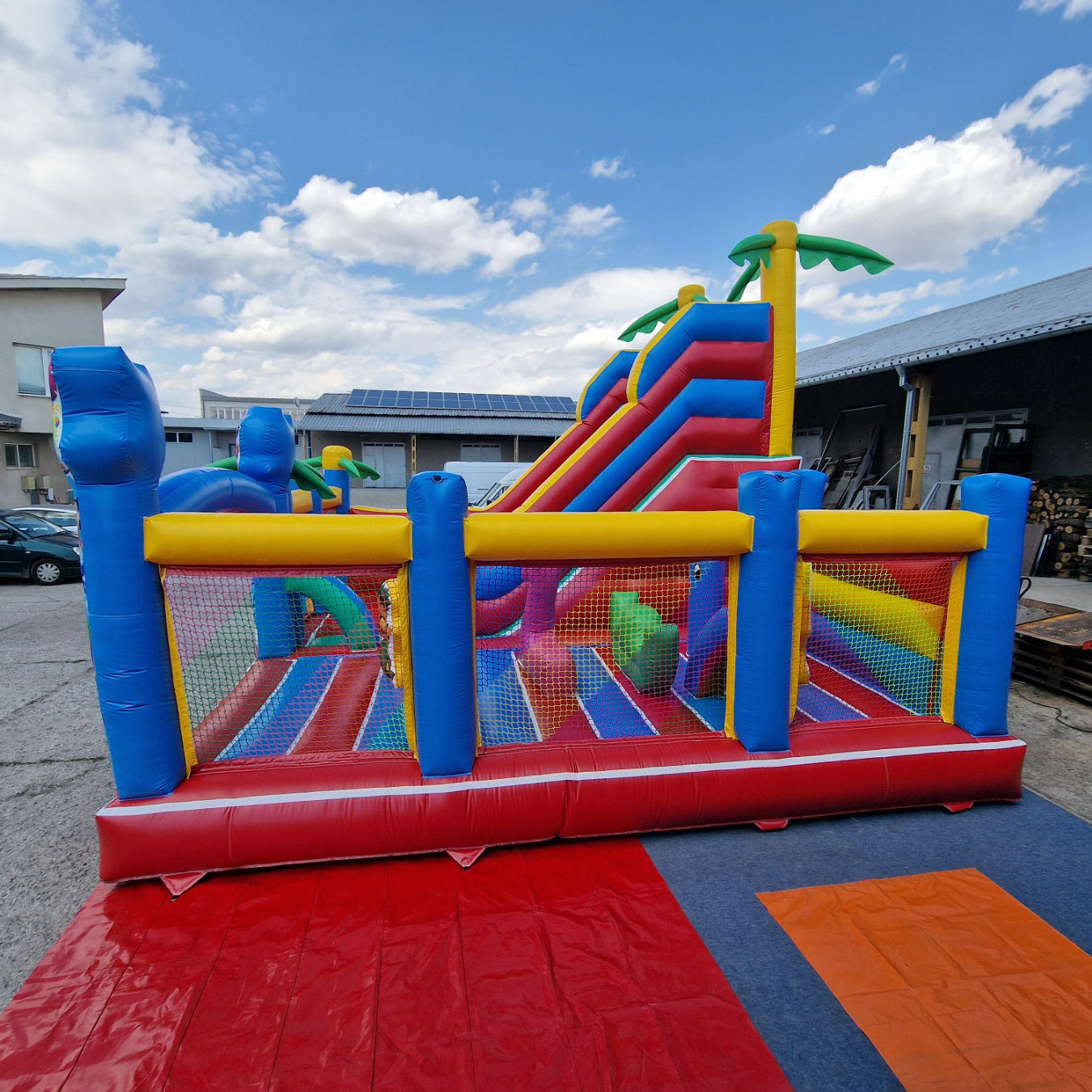 Съоръжението включва пързалка, тунели и меки препятствия, които насърчават активната игра и двигателното развитие. Изработен е от устойчиви и безопасни материали, подходящи за външна и вътрешна употреба. Батутът е лесен за монтаж и подходящ за рождени дни, събития или просто весели игри в двора.