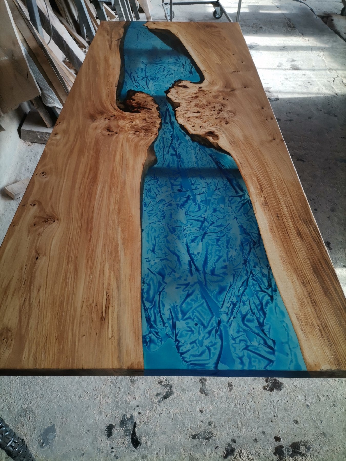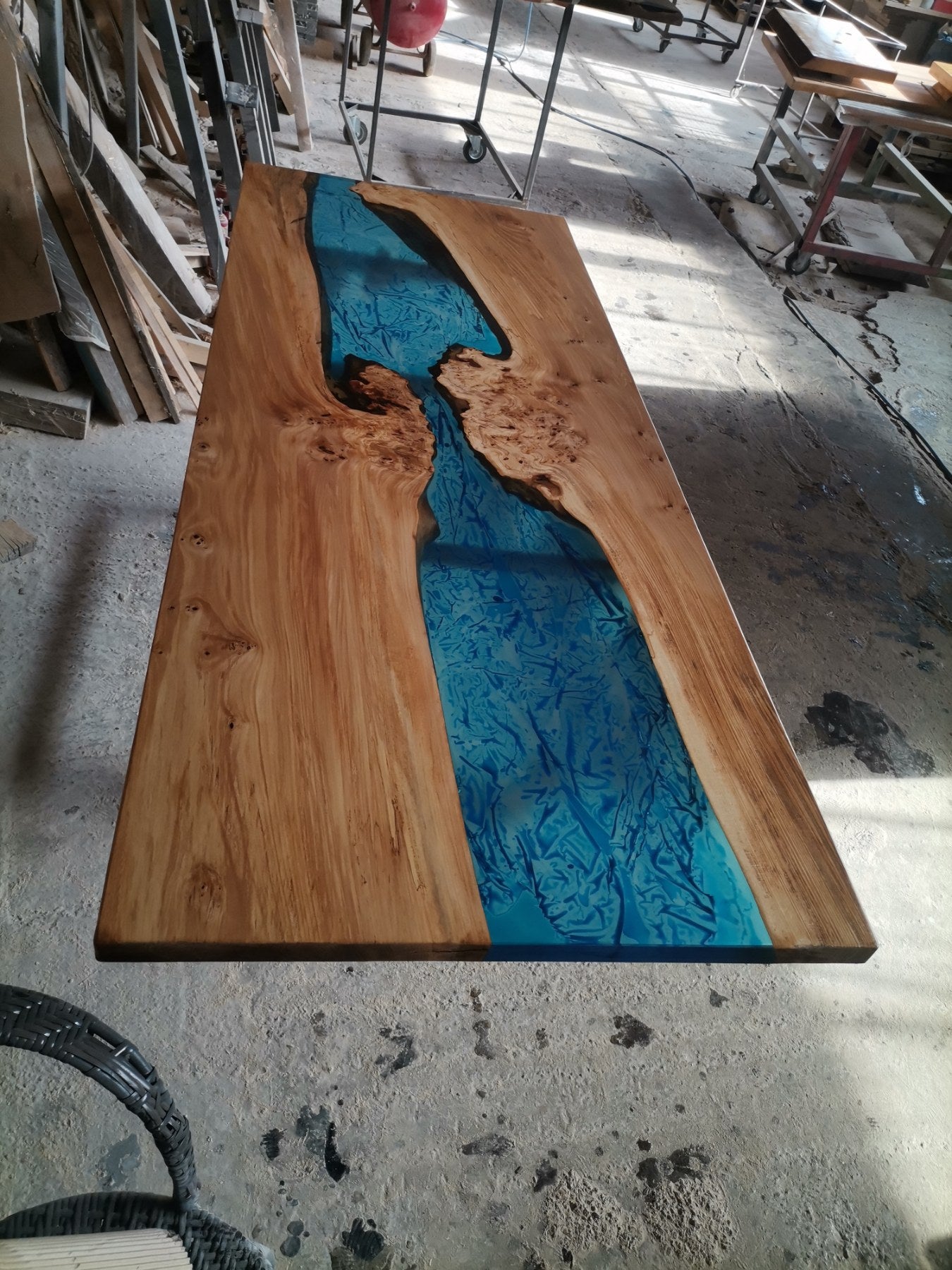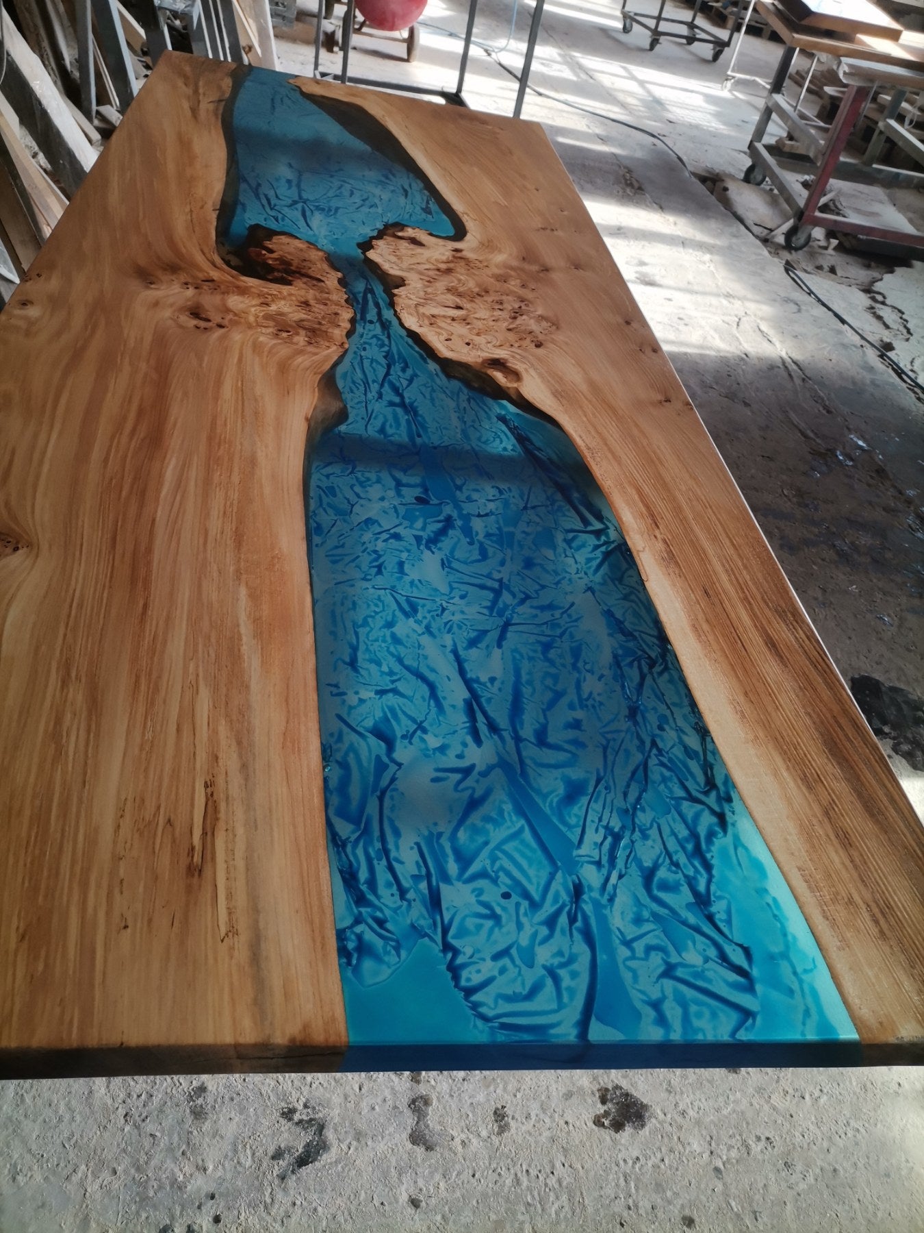 Трапезна маса от масив и синя епоксидна смола. Ръчно полирана повърхност, подчертаваща дълбочината на цветовете и текстурата.