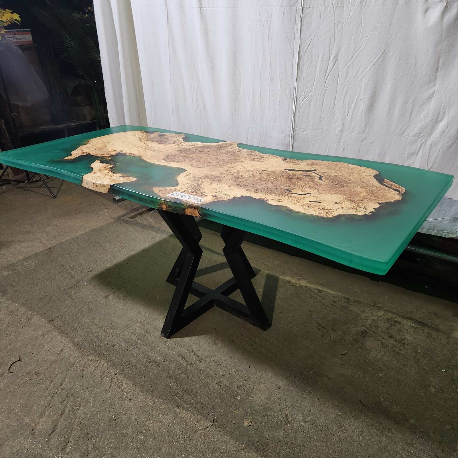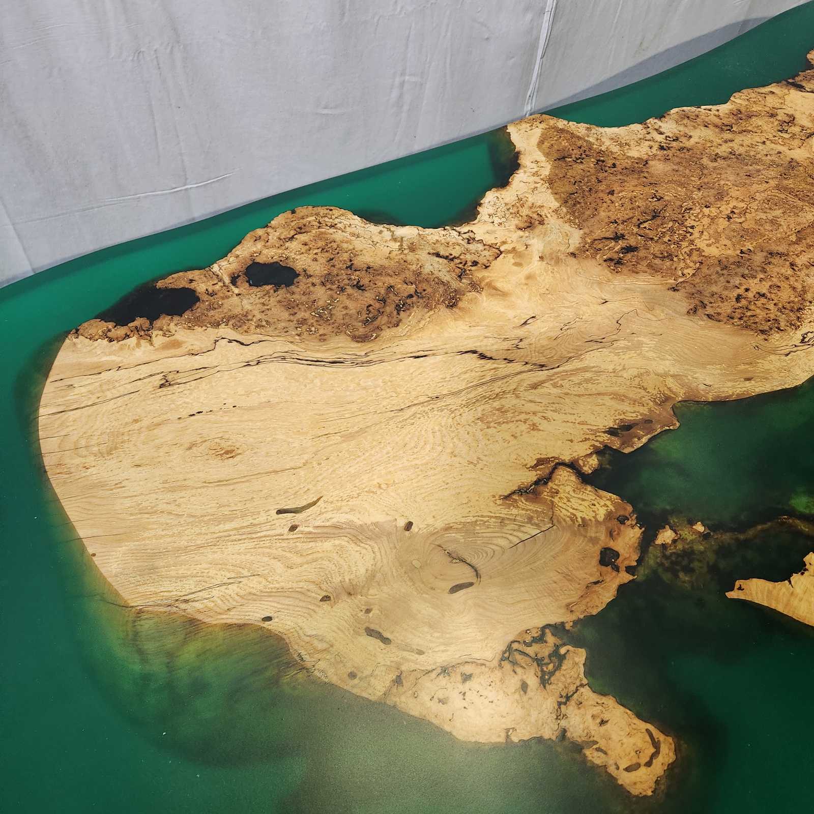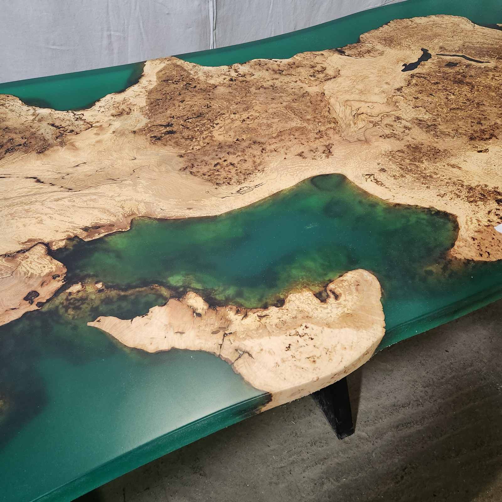 Масата е изработена от масивно ясеново дърво със запазен естествен „жив ръб“, който подчертава автентичната форма на дървото. Зелената епоксидна смола добавя свеж, модерен акцент и създава красив контраст със светлите шарки на ясенa. Повърхността е здрава, гладка и устойчива на ежедневна употреба. Подходяща е за интериори, които търсят комбинация от природна естетика и съвременен дизайн.
