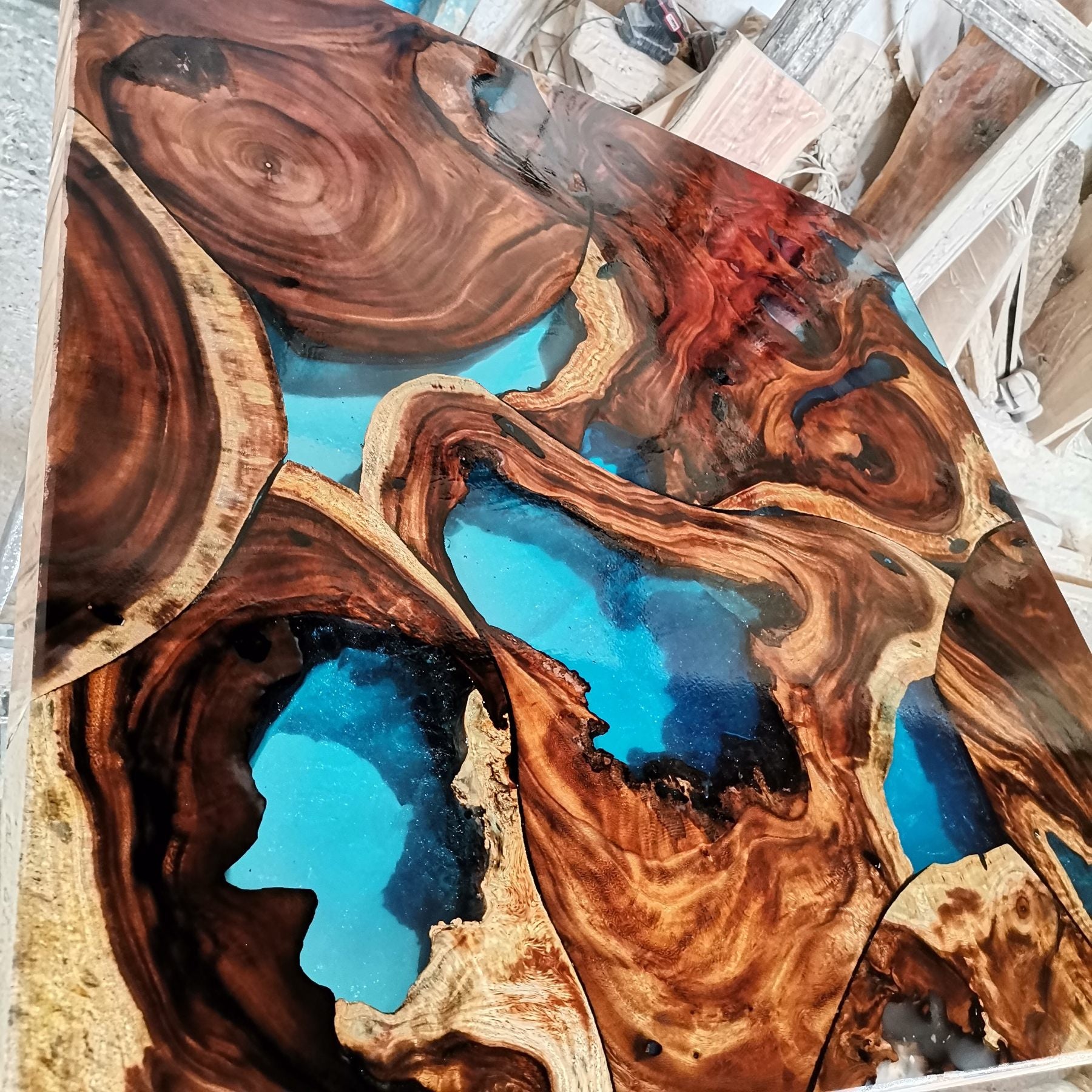 Уникална маса от корен на тик и синя прозрачна епоксидна смола. Естествените форми на дървото се преплитат с кристалната дълбочина на смолата, създавайки усещане за движение и елегантност. Акцент, който превръща всяко пространство в изключително.