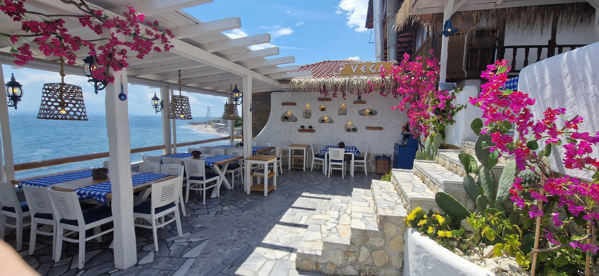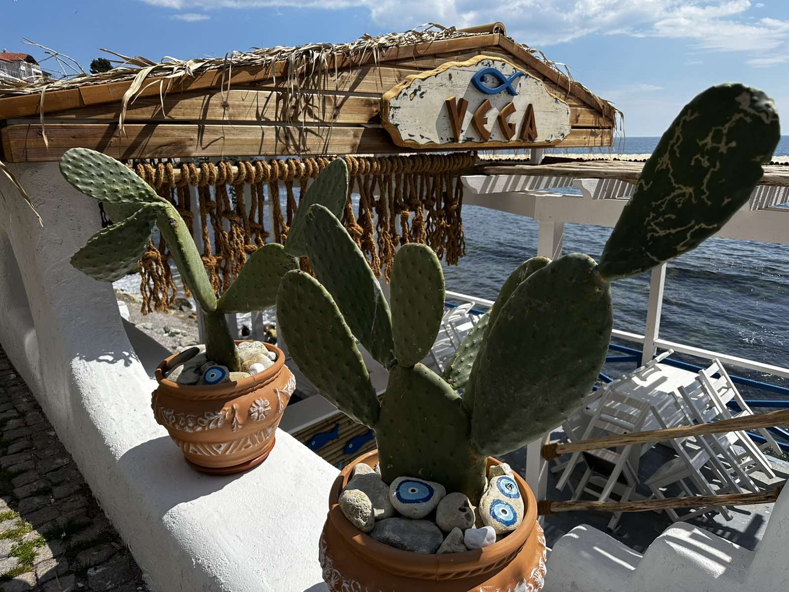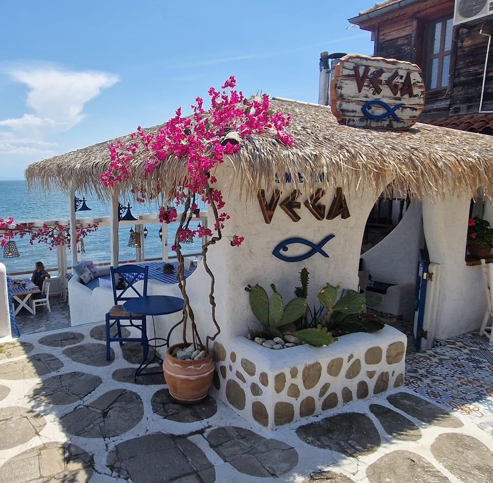 Добре дошли в нашата бохо-тропическа дестинация – ресторант VEGA на брега на морето, в който естествените материали срещат вдъхновяващия дизайн. Работихме усилено, за да пресъздадем автентично усещане, като използвахме гъсти покрития от палмови листа за покрива и чадърите, осигуряващи истинска сянка. Визуалният цветен акцент е поставен върху цикламената Бугенвилия и дръвчета, чиито наситени цветове привличат погледа. Вечерната атмосфера е дело на тъканите лампи от ратан и морска трева, които обгръщат пространството в топъл, кехлибарен ореол. Добавихме изтънченост със зелени екзотични кактуси, които финално запечатват уникалния стил.
