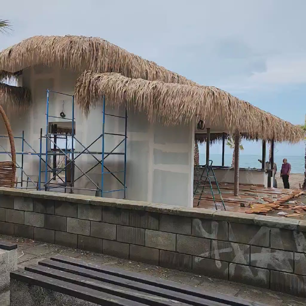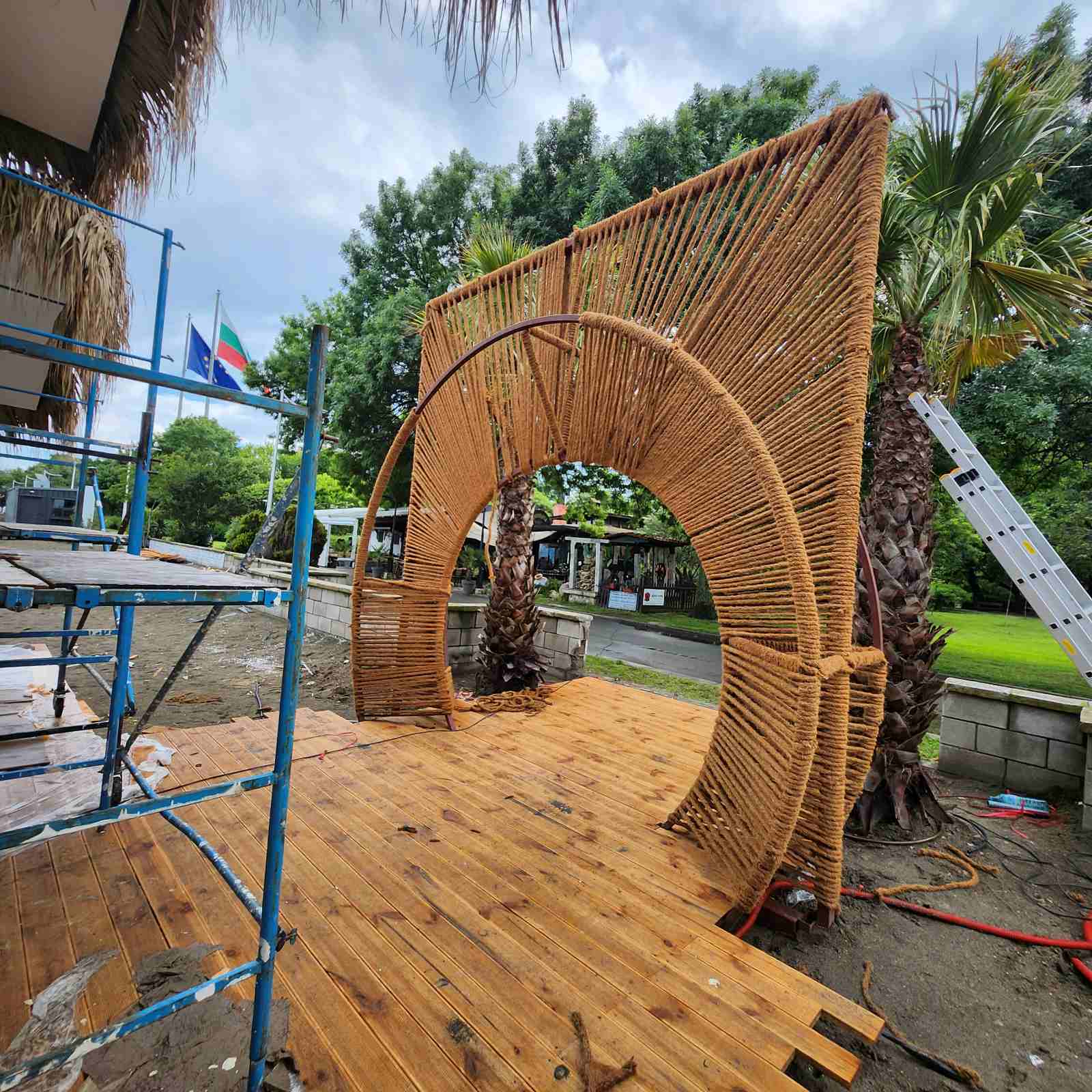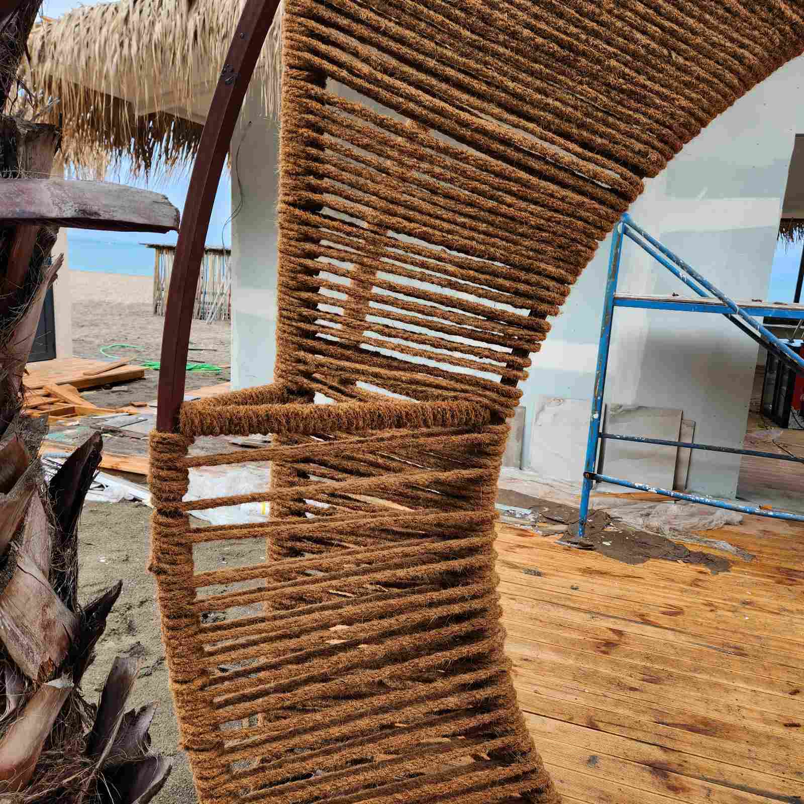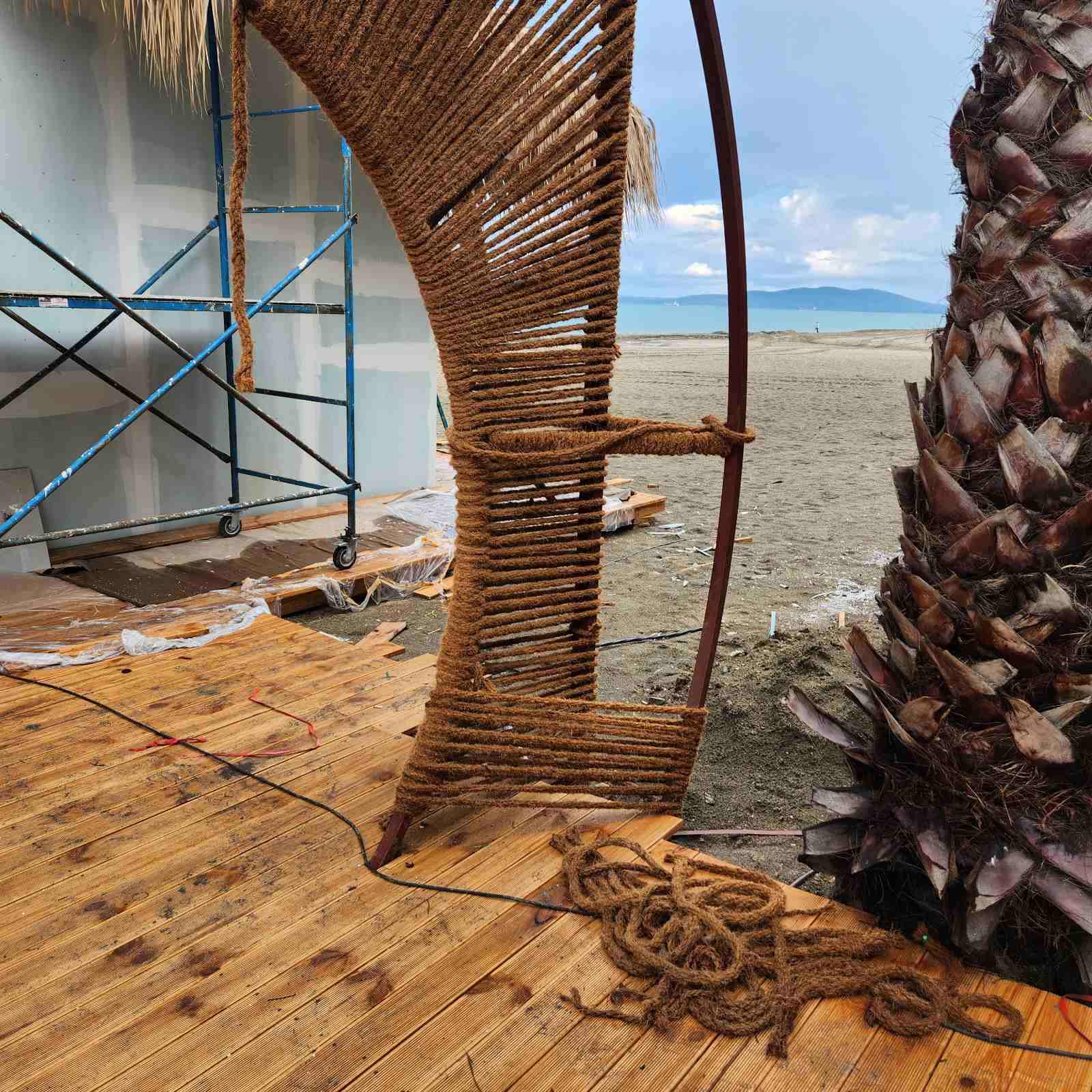 Декорът на Marrakesh Beach Bar & Club демонстрира нашия артистичен подход в създаването на забележителни архитектурни акценти с естествени материали. Централно място заема внушителната арка от кокосови въжета, която приветства гостите с бохемско, ръчно изработено излъчване, превръщайки входа в незабравима фотографска точка. Тази уникална, масивна конструкция е изработена чрез плътно наплитане на трайно кокосово въже върху метална основа, гарантирайки едновременно здравина и пленителна визия. Покривът е покрит с автентични панели от палмови листа, които осигуряват естествена сянка и прохлада, придавайки на обекта неповторим тропически характер.