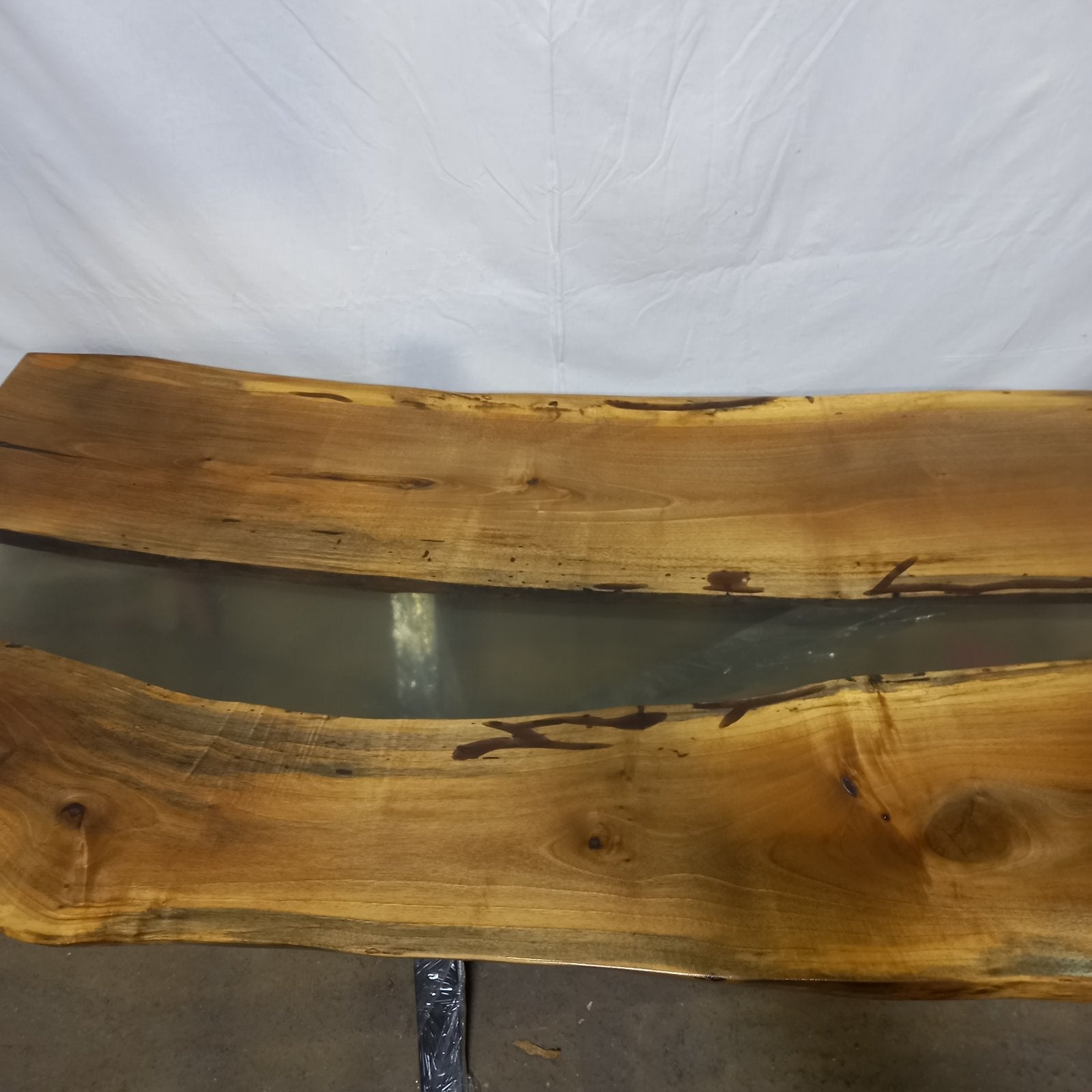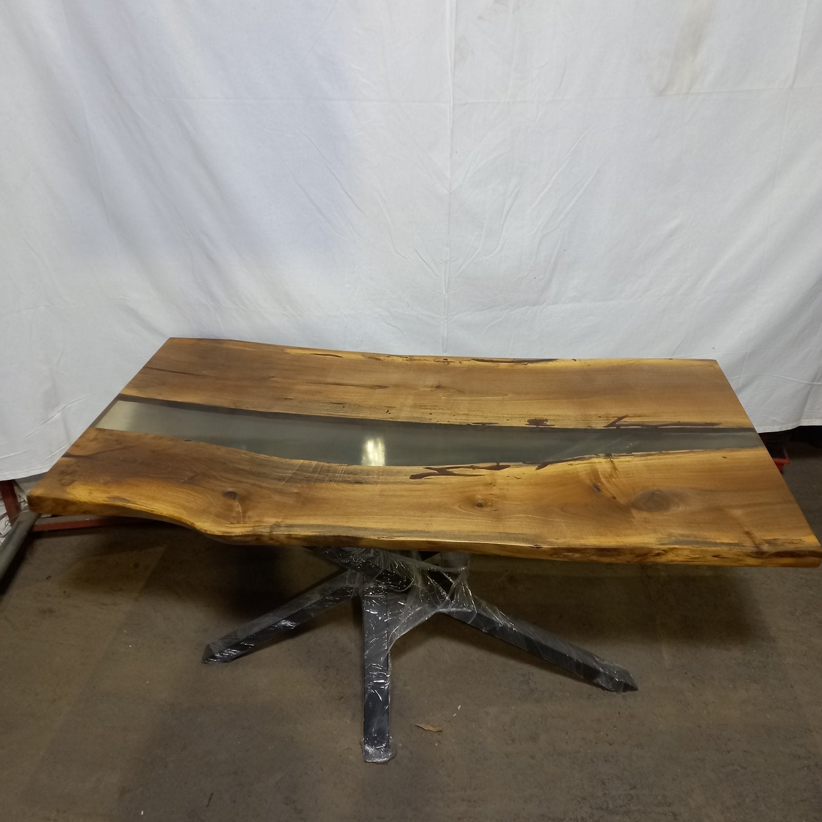 Прозрачната смола подчертава естествените линии на ореха и придава дълбочина и елегантност. Стабилната метална конструкция осигурява устойчивост и стилен индустриален акцент. Идеален избор за интериор с характер – изчистен, модерен и луксозен.