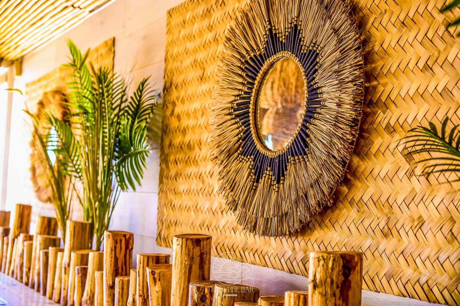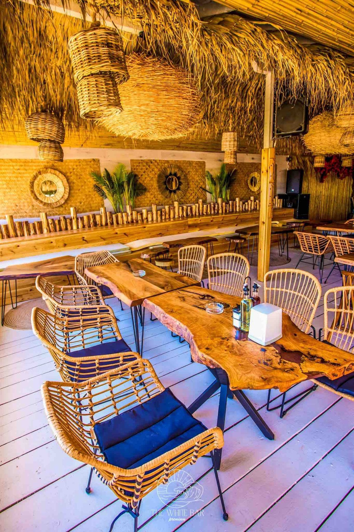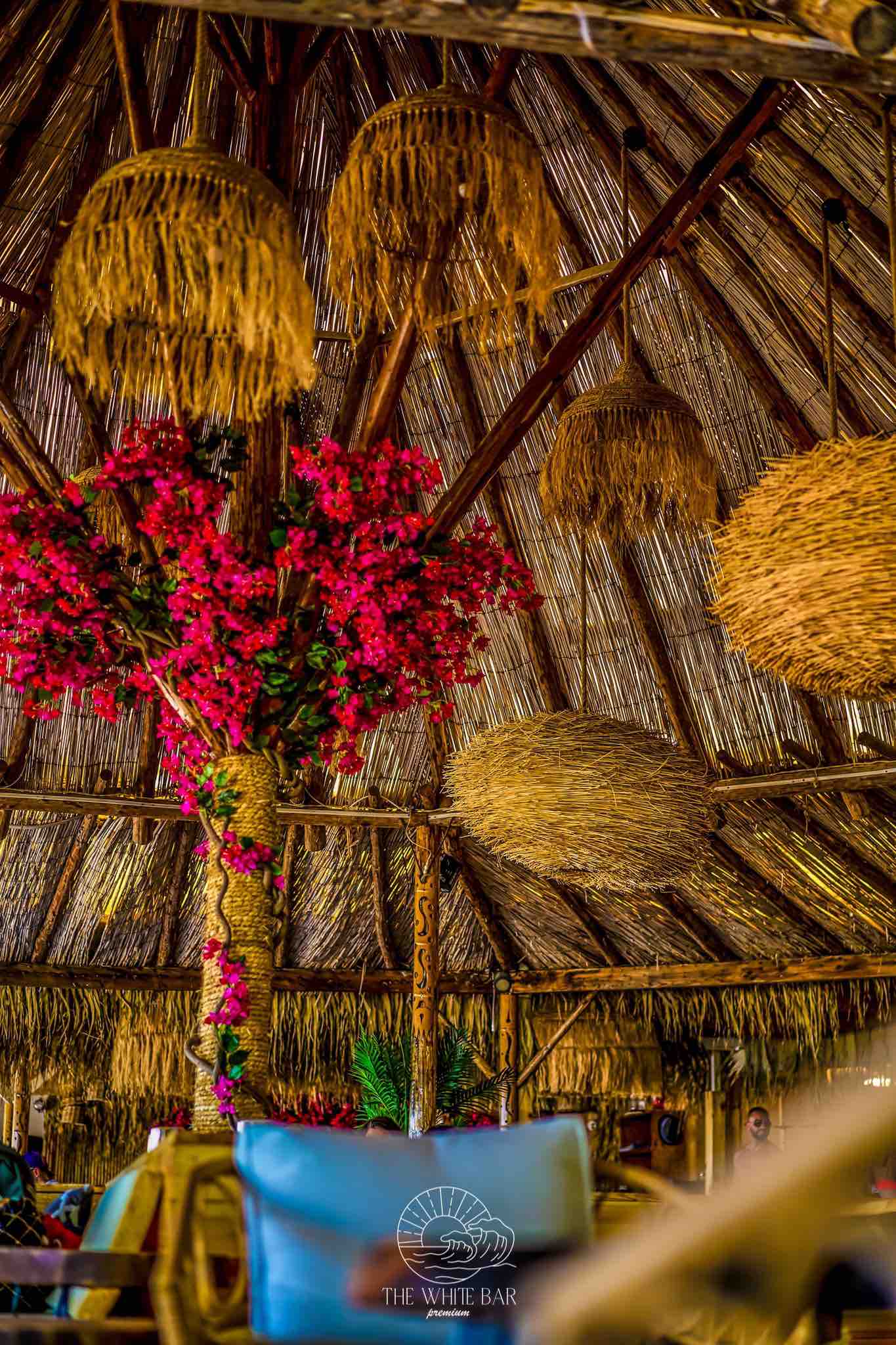 При декорирането на The White bar ние демонстрирахме как декоративните елементи могат да преобразят едно пространство. Ефектното осветление е осигурено от внушителни висящи лампи, изработени от екологична морска трева, които стоят като артистични скулптури. Зоната за сядане е оборудвана с гладки дървени маси и изящни столове от ратан, внасяйки топлина и органичен вид. Акцентното дръвче цикламена Бугенвилия добавя наситен, нежен цвят, който контрастира прекрасно със свежото изкуствено покритие по стените. Кръглите декоративни огледала внасят блясък и оптична дълбочина, завършвайки уютната и луксозна визия.