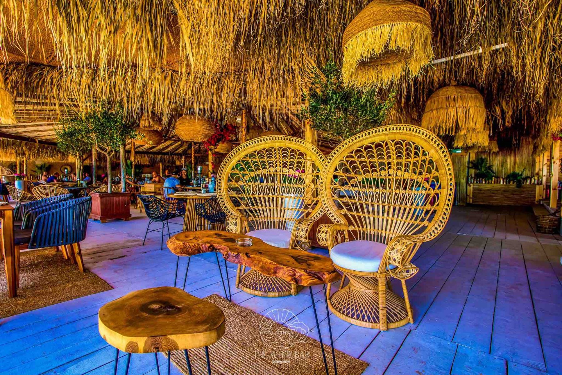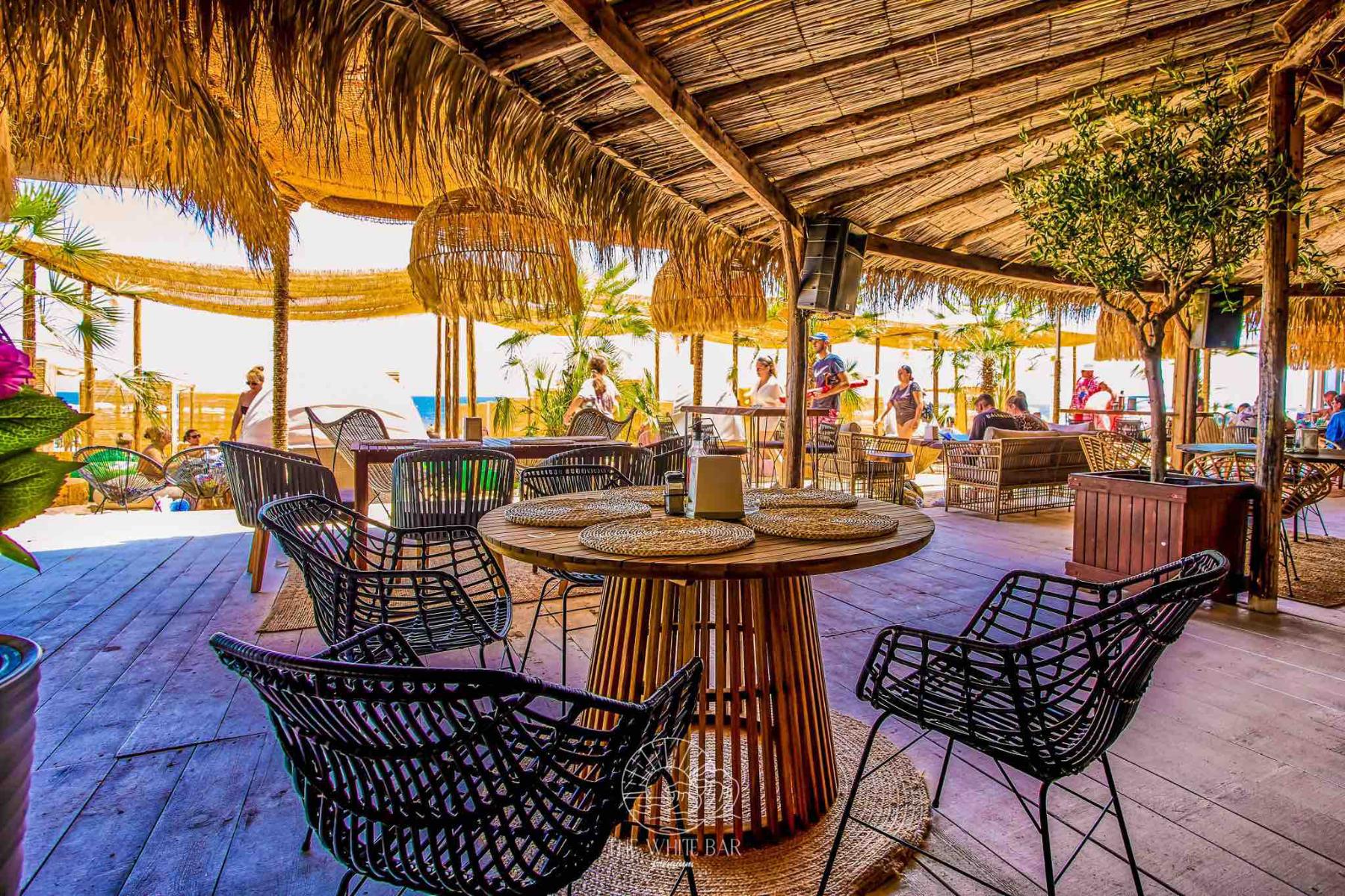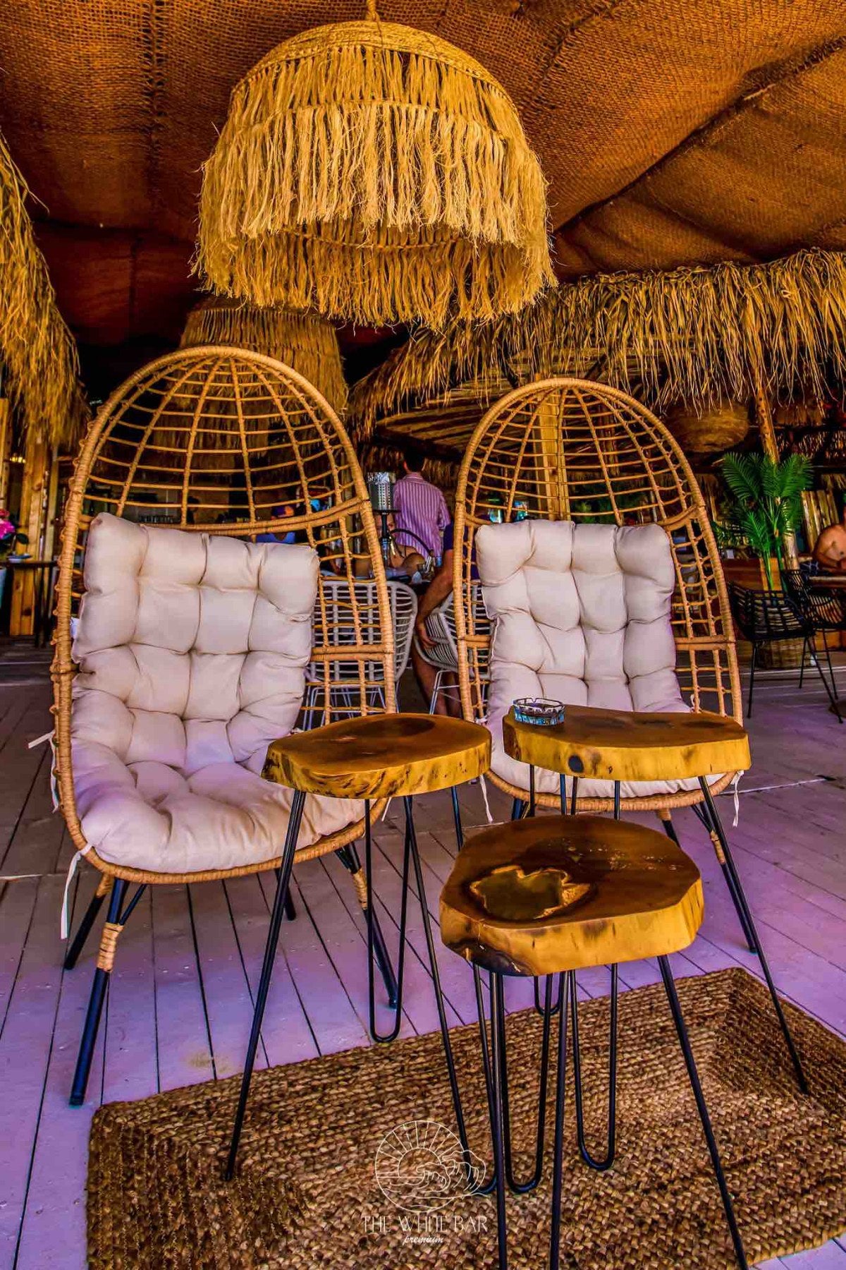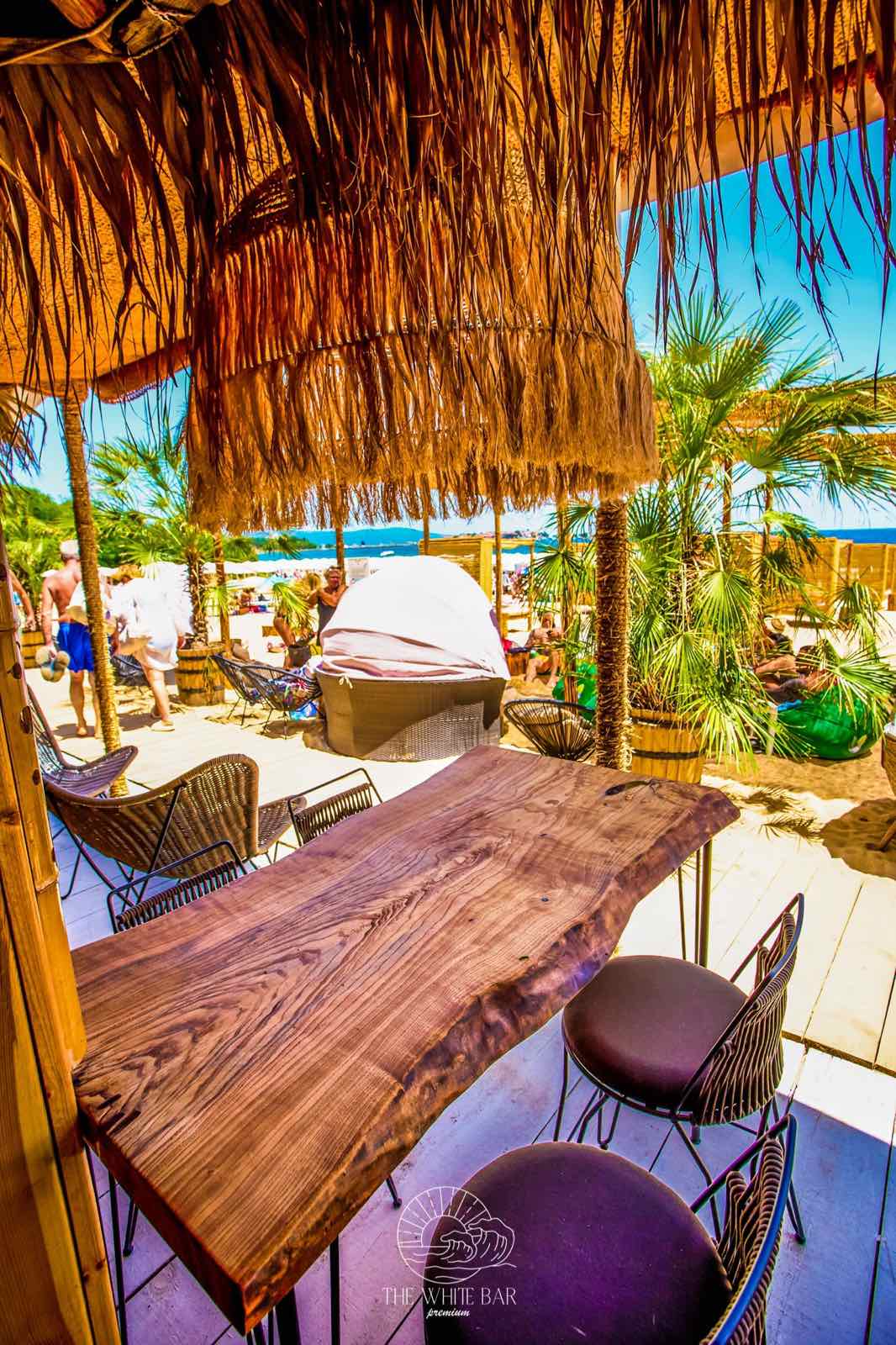 При декорирането на The White bar ние демонстрирахме как декоративните елементи могат да преобразят едно пространство. Ефектното осветление е осигурено от внушителни висящи лампи, изработени от екологична морска трева, които стоят като артистични скулптури. Зоната за сядане е оборудвана с гладки дървени маси и изящни столове от ратан, внасяйки топлина и органичен вид. Акцентното дръвче цикламена Бугенвилия добавя наситен, нежен цвят, който контрастира прекрасно със свежото изкуствено покритие по стените. Кръглите декоративни огледала внасят блясък и оптична дълбочина, завършвайки уютната и луксозна визия.