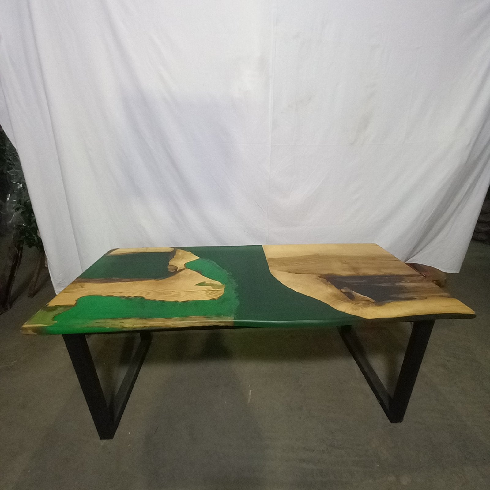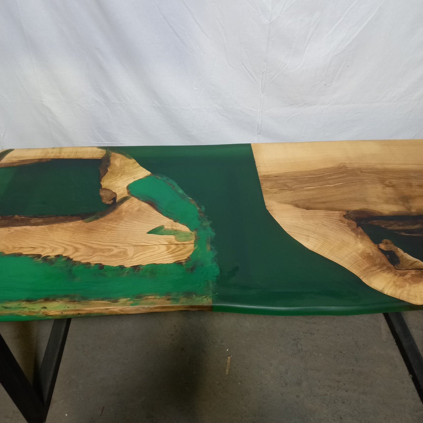 Маса от масив и зелена смола. Гладка повърхност от епоксидна смола, подчертаваща красотата на масивното дърво.